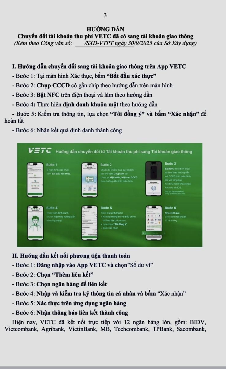 Ngày 30/9/2025, Sở Xây dựng tỉnh Quảng Ngãi ban hành Công văn số 1853/SXD-VTPT về việc tuyên truyền, hướng dẫn chuyển đổi tài khoản thu phí (VETC) đã có sang tài khoản giao thông, nội dung cụ thể như sau: