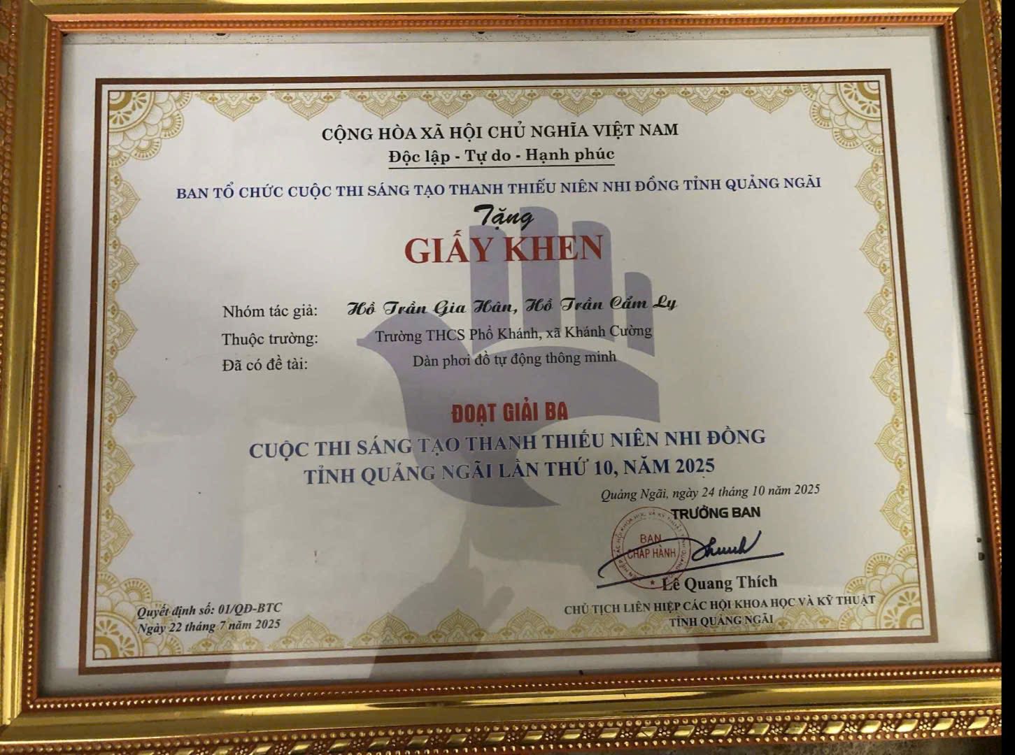 Thầy và trò Trường THCS Phổ Khánh xã Khánh Cường đạt Giải Ba trong Cuộc thi Sáng tạo Thanh Thiếu niên, Nhi đồng lần thứ 10 năm 2025