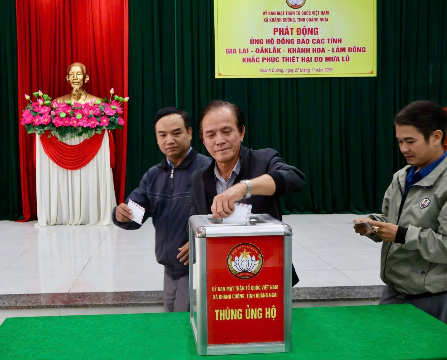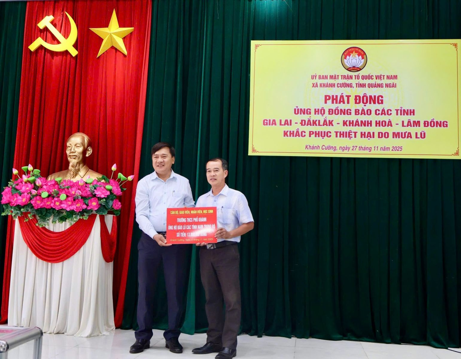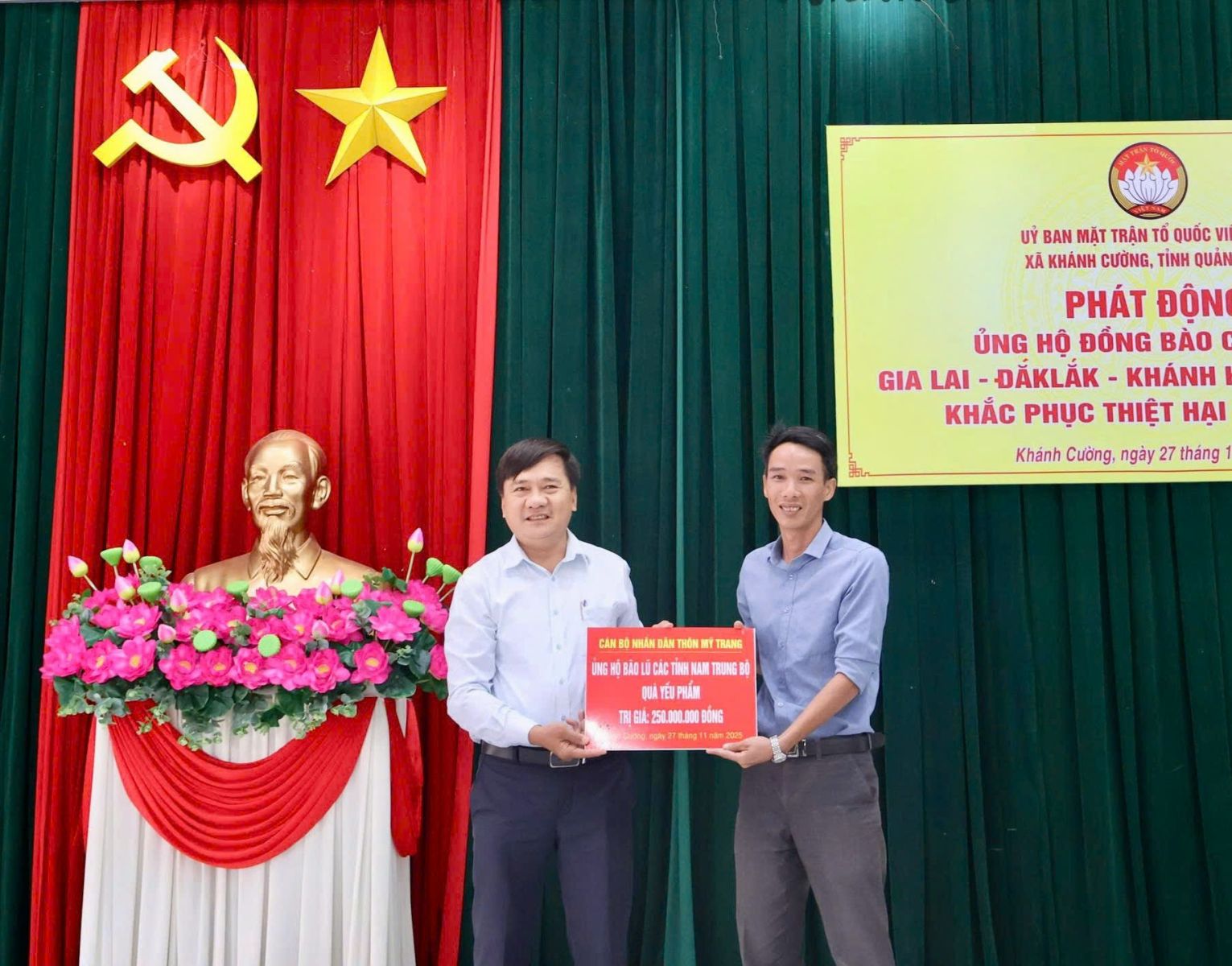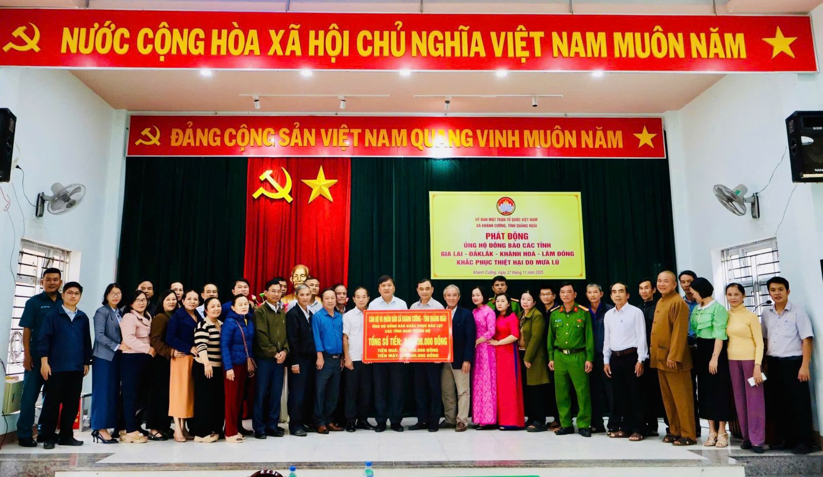 Hưởng ứng Lời kêu gọi của Đoàn Chủ tịch Ủy ban Trung ương Mặt trận Tổ quốc Việt Nam. Thực hiện Công văn kêu gọi của Ban Thường trực Ủy ban MTTQ Việt Nam tỉnh Quảng Ngãi. Được sự nhất trí của Thường trực Đảng ủy xã, với tinh thần “tương thân tương ái”, “lá lành đùm lá rách”. Chiều ngày 27/11/2025, tại Hội trường Đảng ủy, Ban Thường trực Ủy ban MTTQ Việt Nam xã Khánh Cường phát động đợt ủng hộ Nhân dân các tỉnh Đăk lăk, Gia Lai, Khánh Hòa, Lâm Đồng, khắc phục thiệt hại do mưa lũ gây ra.