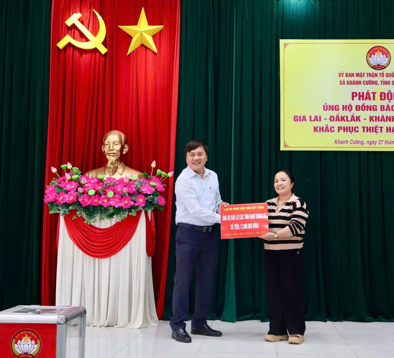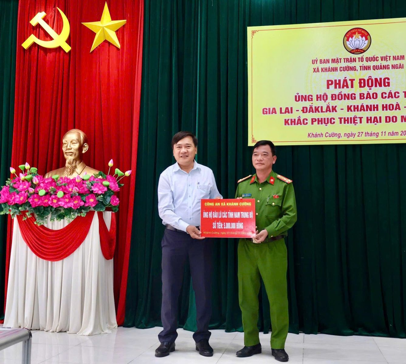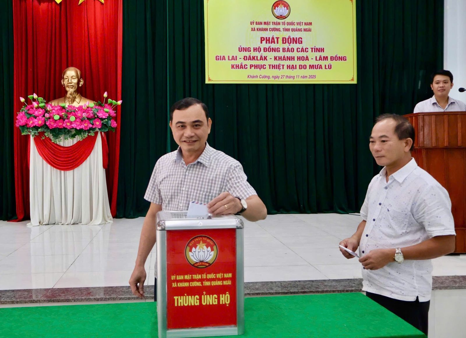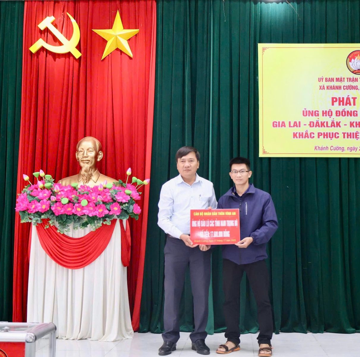 Hưởng ứng Lời kêu gọi của Đoàn Chủ tịch Ủy ban Trung ương Mặt trận Tổ quốc Việt Nam. Thực hiện Công văn kêu gọi của Ban Thường trực Ủy ban MTTQ Việt Nam tỉnh Quảng Ngãi. Được sự nhất trí của Thường trực Đảng ủy xã, với tinh thần “tương thân tương ái”, “lá lành đùm lá rách”. Chiều ngày 27/11/2025, tại Hội trường Đảng ủy, Ban Thường trực Ủy ban MTTQ Việt Nam xã Khánh Cường phát động đợt ủng hộ Nhân dân các tỉnh Đăk lăk, Gia Lai, Khánh Hòa, Lâm Đồng, khắc phục thiệt hại do mưa lũ gây ra.