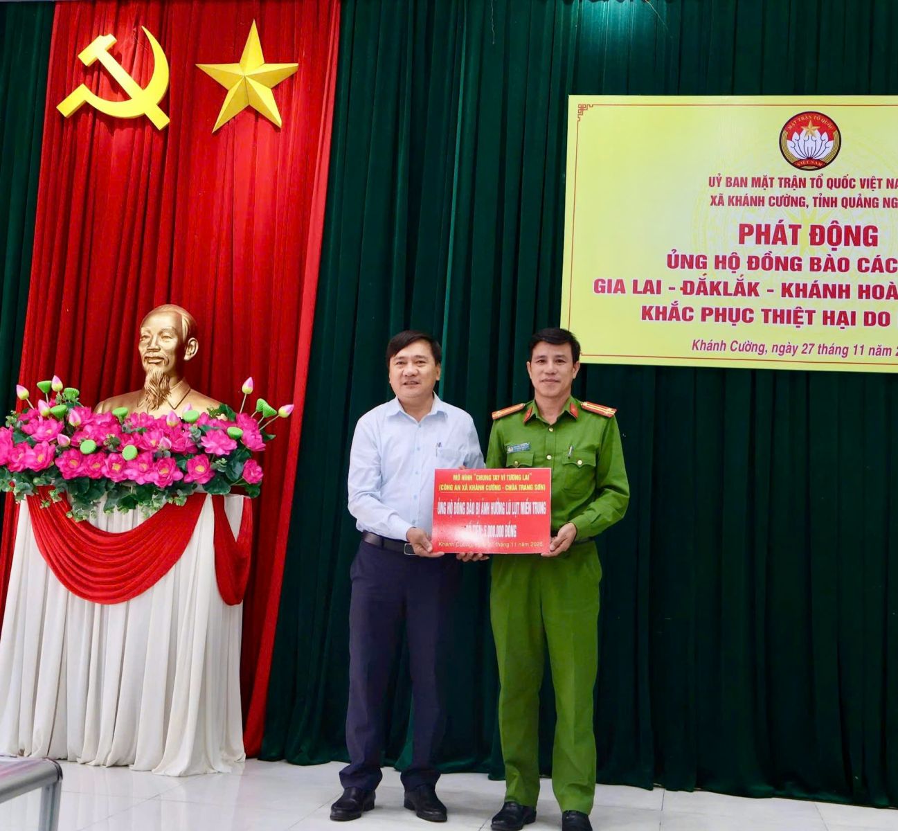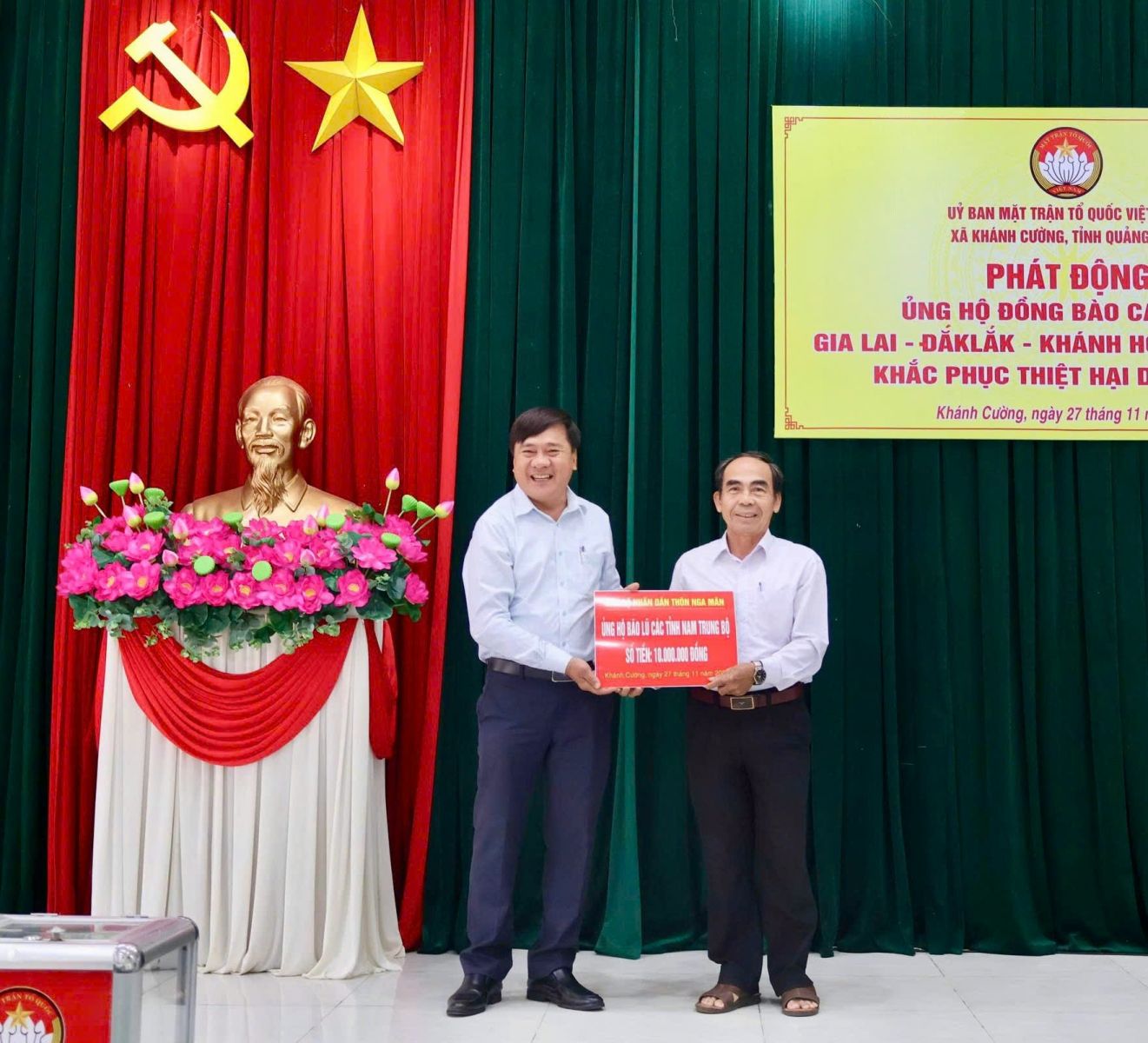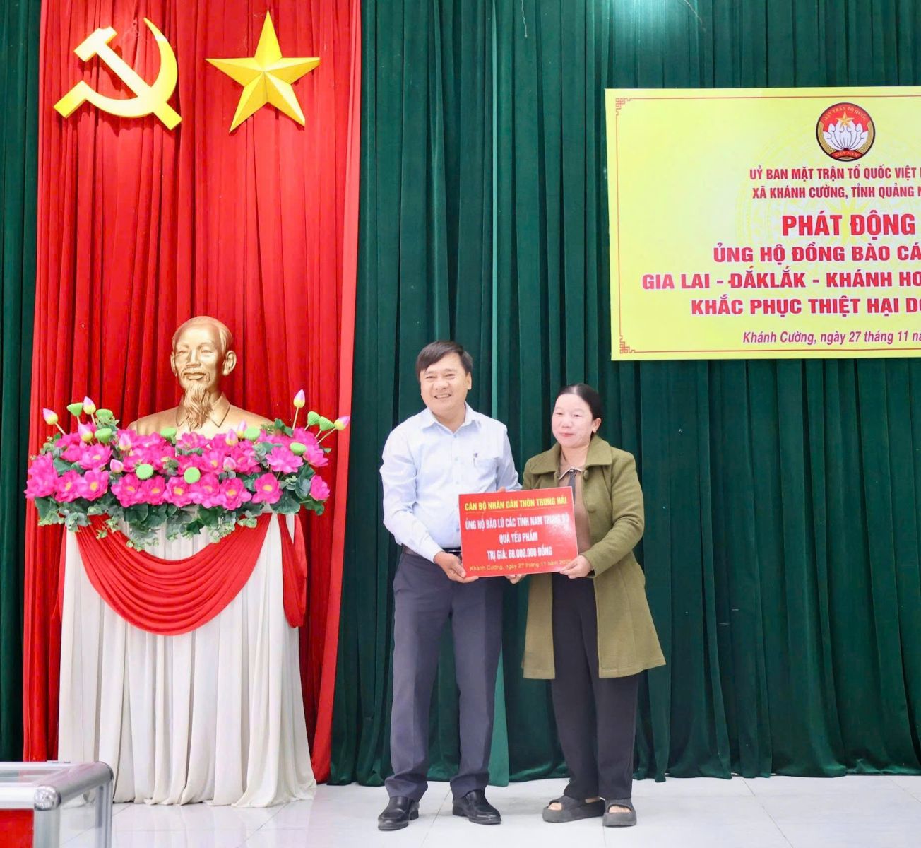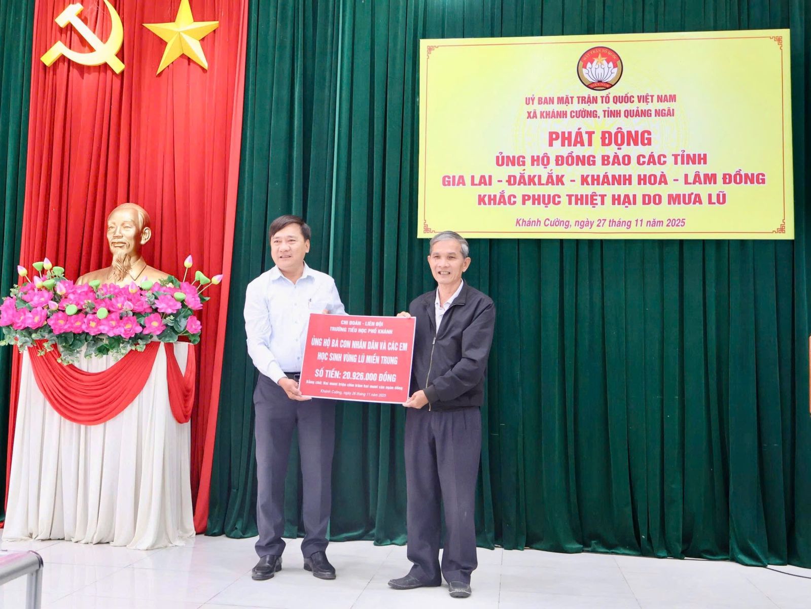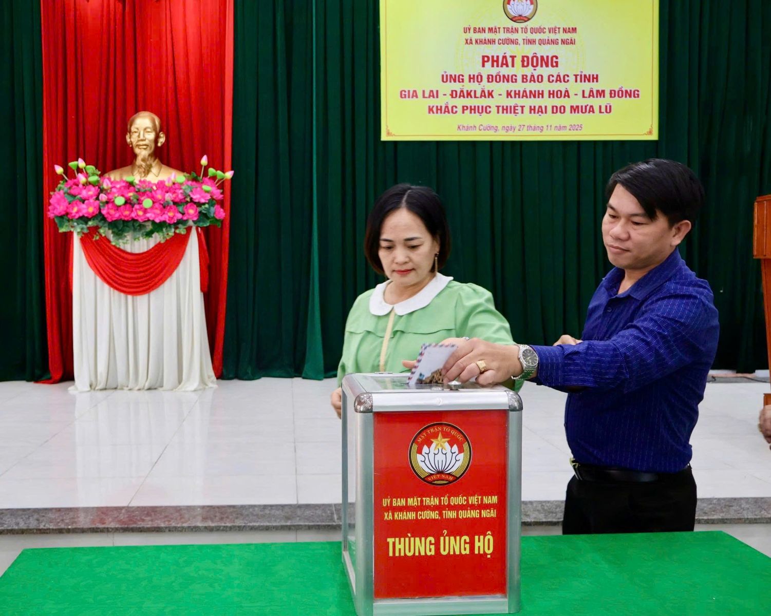 Hưởng ứng Lời kêu gọi của Đoàn Chủ tịch Ủy ban Trung ương Mặt trận Tổ quốc Việt Nam. Thực hiện Công văn kêu gọi của Ban Thường trực Ủy ban MTTQ Việt Nam tỉnh Quảng Ngãi. Được sự nhất trí của Thường trực Đảng ủy xã, với tinh thần “tương thân tương ái”, “lá lành đùm lá rách”. Chiều ngày 27/11/2025, tại Hội trường Đảng ủy, Ban Thường trực Ủy ban MTTQ Việt Nam xã Khánh Cường phát động đợt ủng hộ Nhân dân các tỉnh Đăk lăk, Gia Lai, Khánh Hòa, Lâm Đồng, khắc phục thiệt hại do mưa lũ gây ra.