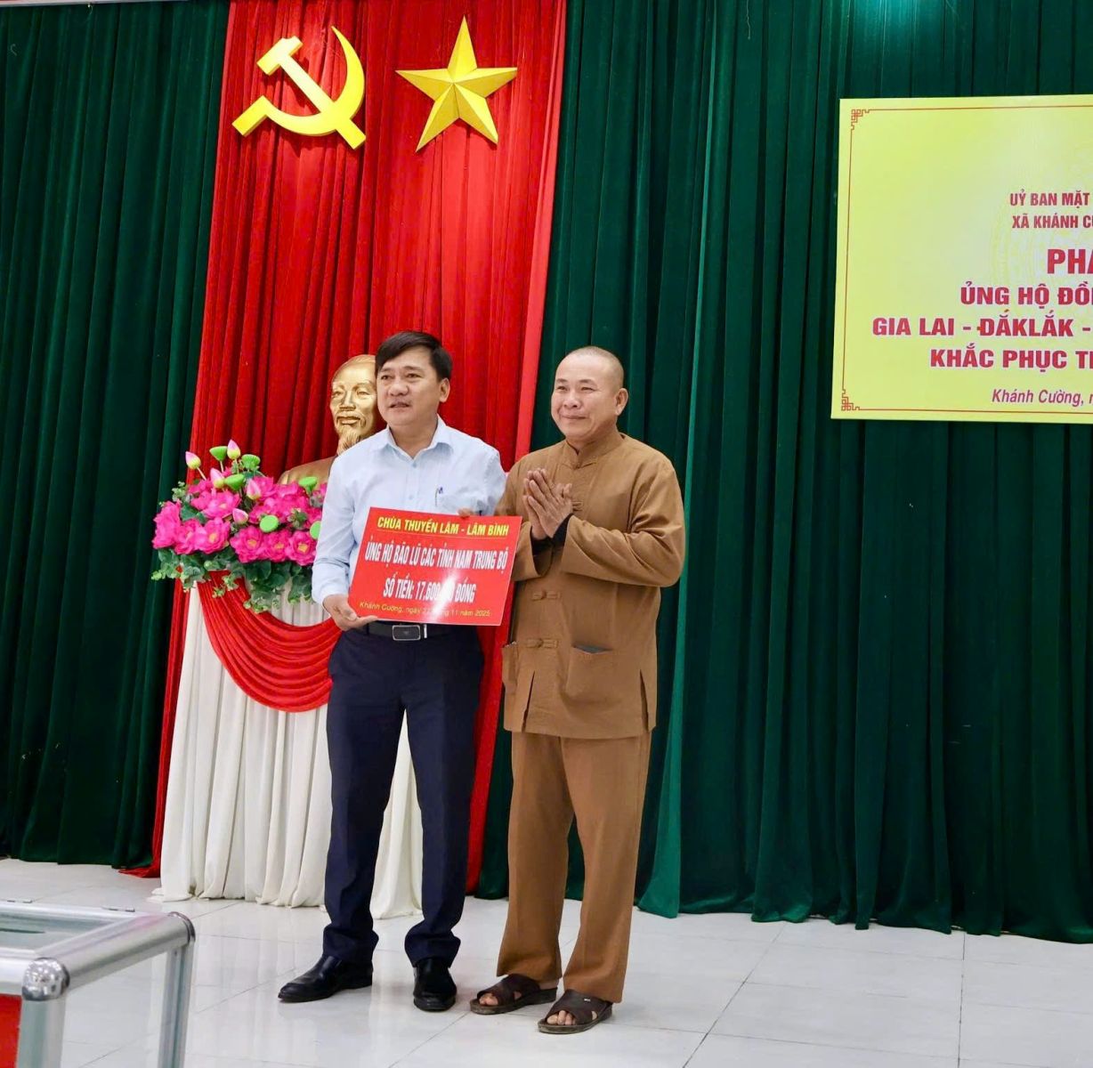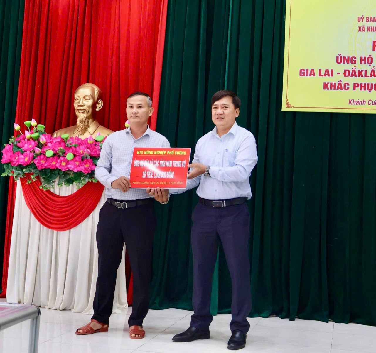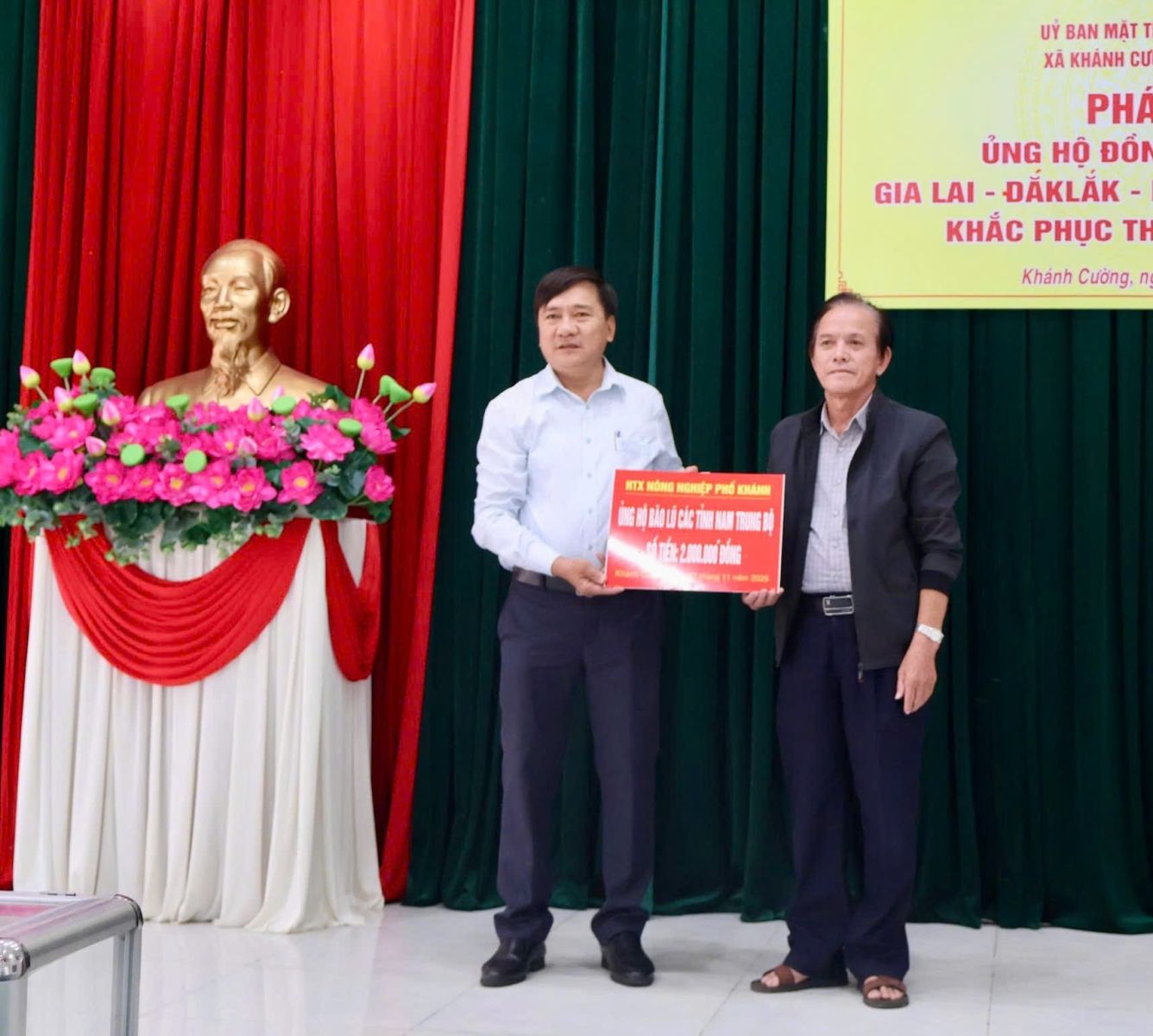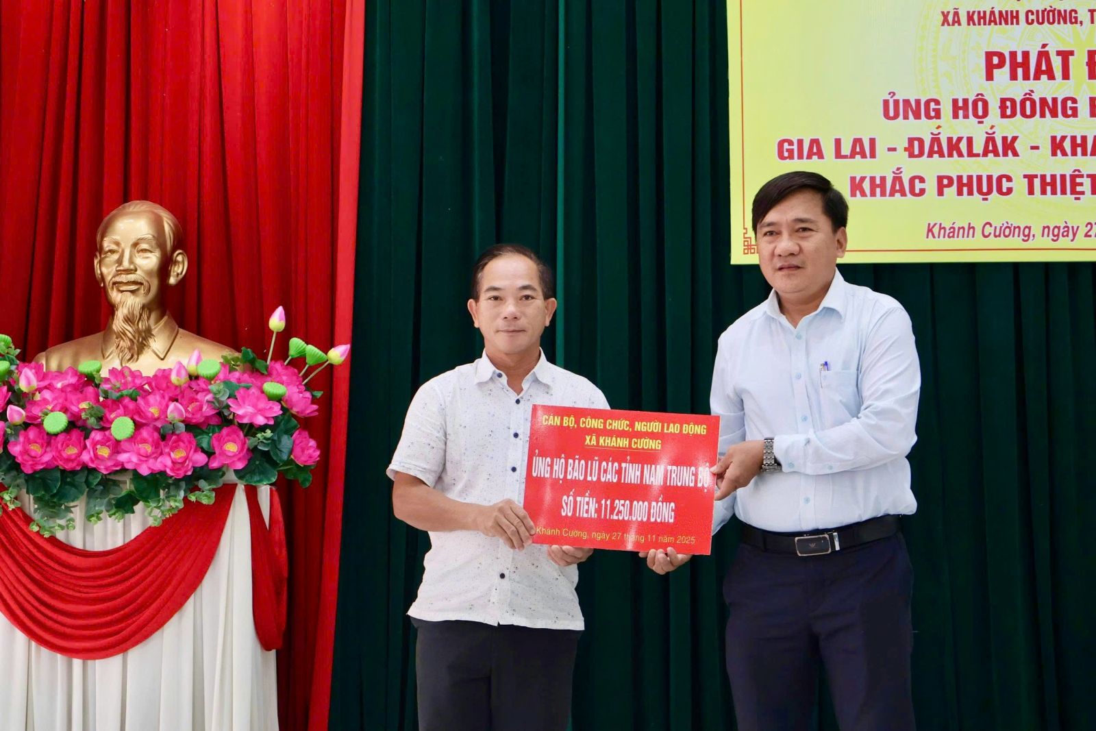 Hưởng ứng Lời kêu gọi của Đoàn Chủ tịch Ủy ban Trung ương Mặt trận Tổ quốc Việt Nam. Thực hiện Công văn kêu gọi của Ban Thường trực Ủy ban MTTQ Việt Nam tỉnh Quảng Ngãi. Được sự nhất trí của Thường trực Đảng ủy xã, với tinh thần “tương thân tương ái”, “lá lành đùm lá rách”. Chiều ngày 27/11/2025, tại Hội trường Đảng ủy, Ban Thường trực Ủy ban MTTQ Việt Nam xã Khánh Cường phát động đợt ủng hộ Nhân dân các tỉnh Đăk lăk, Gia Lai, Khánh Hòa, Lâm Đồng, khắc phục thiệt hại do mưa lũ gây ra.