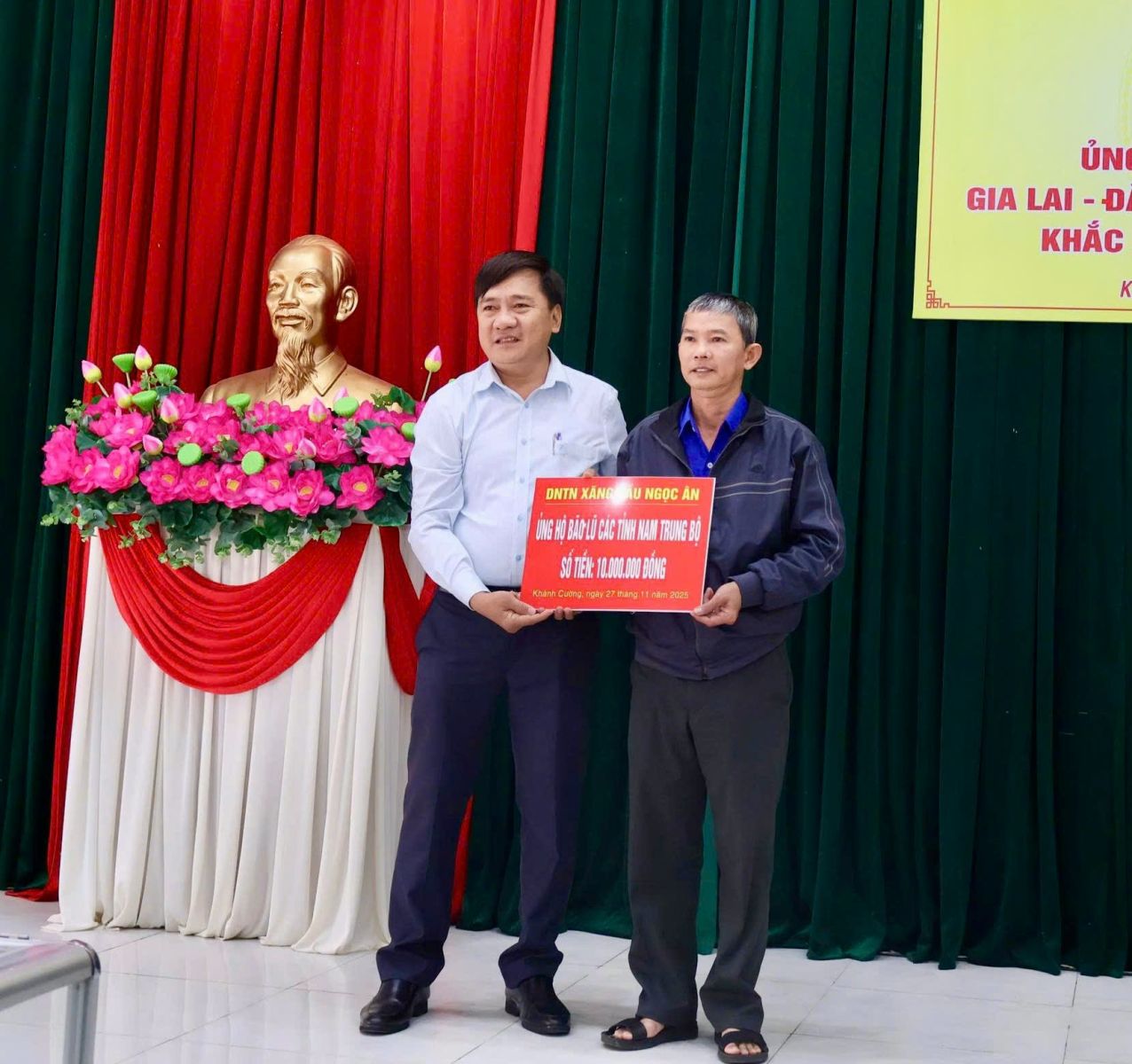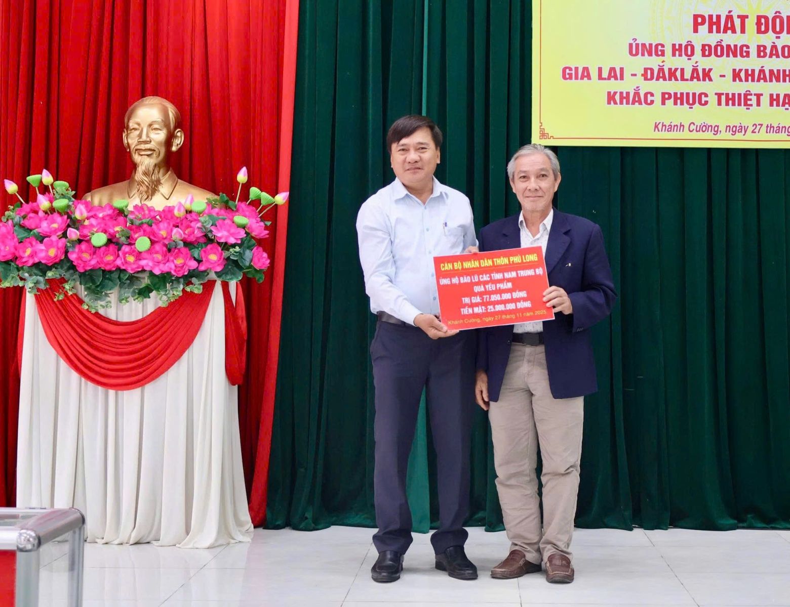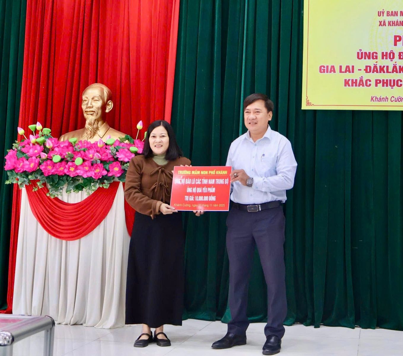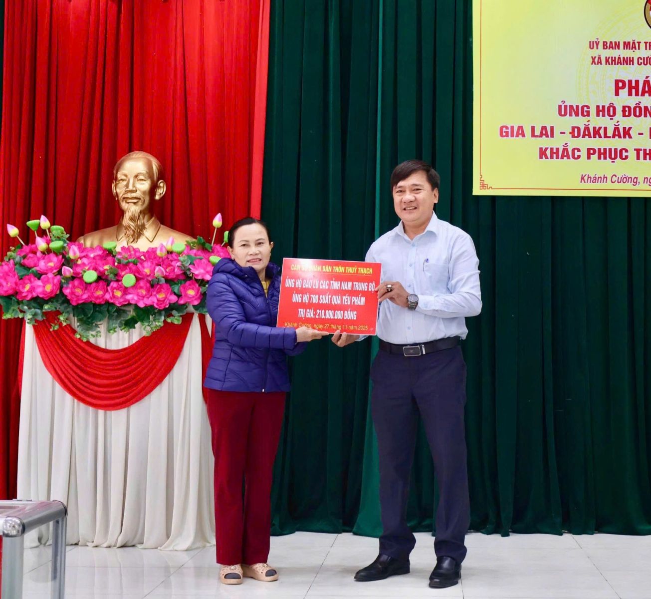 Hưởng ứng Lời kêu gọi của Đoàn Chủ tịch Ủy ban Trung ương Mặt trận Tổ quốc Việt Nam. Thực hiện Công văn kêu gọi của Ban Thường trực Ủy ban MTTQ Việt Nam tỉnh Quảng Ngãi. Được sự nhất trí của Thường trực Đảng ủy xã, với tinh thần “tương thân tương ái”, “lá lành đùm lá rách”. Chiều ngày 27/11/2025, tại Hội trường Đảng ủy, Ban Thường trực Ủy ban MTTQ Việt Nam xã Khánh Cường phát động đợt ủng hộ Nhân dân các tỉnh Đăk lăk, Gia Lai, Khánh Hòa, Lâm Đồng, khắc phục thiệt hại do mưa lũ gây ra.
